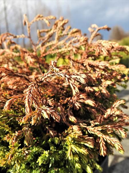 Łuskowate, zimozielone igły, na końcach zaostrzone, odstające, rozmieszczone rzadko, długości 3-4 mm, na gałązkach silnie przylegające, długości około 2,5 mm. Łuski rosnące na dolnej i górnej płaszczyźnie gałązki opatrzone wypukłym gruczołkiem żywicznym, boczne krótsze i bez gruczołków.