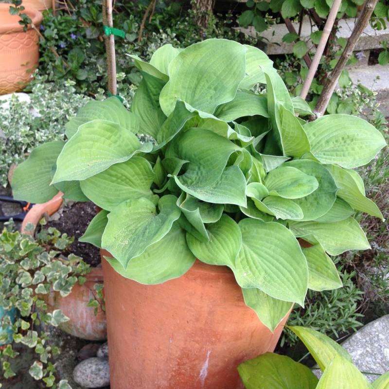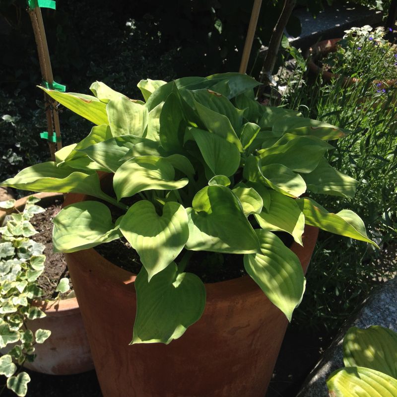 Bezproblemowa hosta; przesadzona z gruntu do donicy w zeszłym sezonie, spokojna zieleń w różnych odcieniach. Kupiona chyba w 2014, w funkia.pl.
