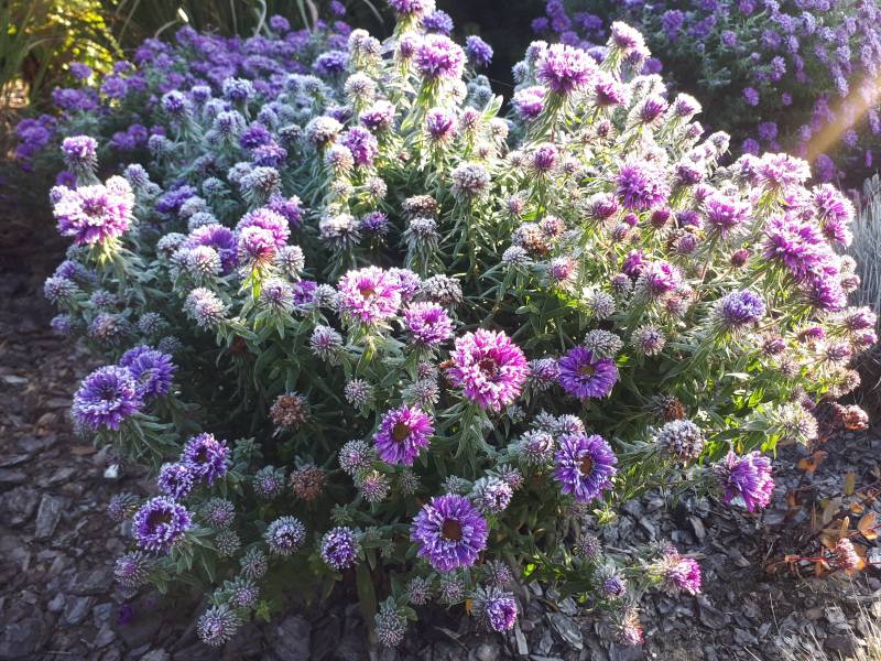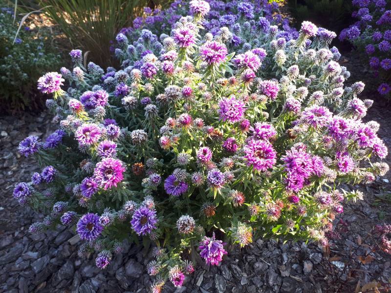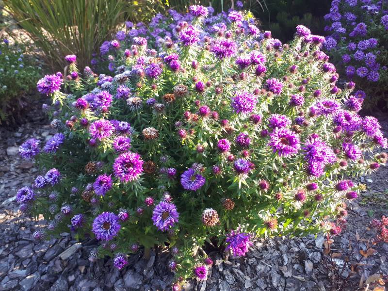 Aster 'Purple Dome' całe lato miał dostatek słońca, ale teraz, jesienią, gdy słonce stoi nisko, połowę dnia spędza w cieniu.