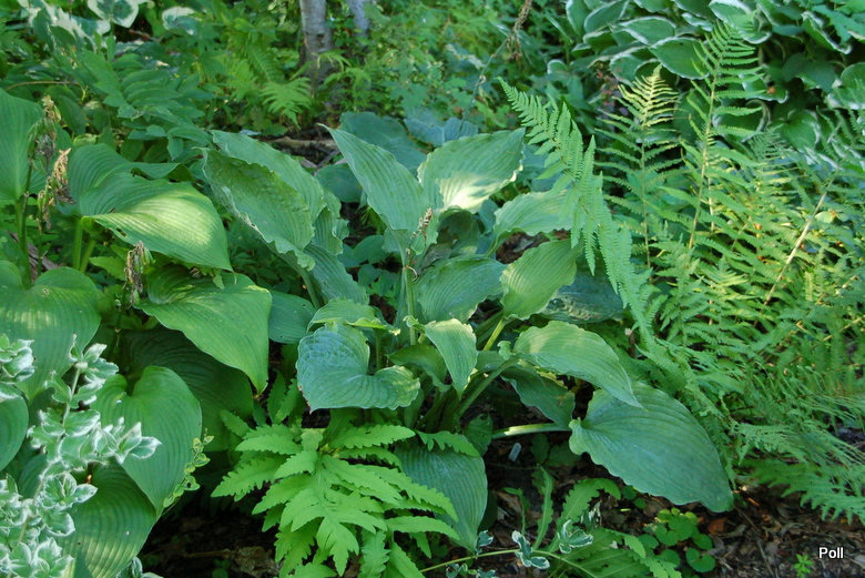 Rozmiar: L (wysokość około 60 cm, szerokość około 90 cm) Liście: podłużno-sercowate z mocno falującym brzegiem, o rozmiarach 40 x 20 cm ; wiosną szaro-białe, w trakcie sezonu zmieniają barwę na niebieskozieloną Kwiaty: niemal białe Zalecane stanowisko: półcień