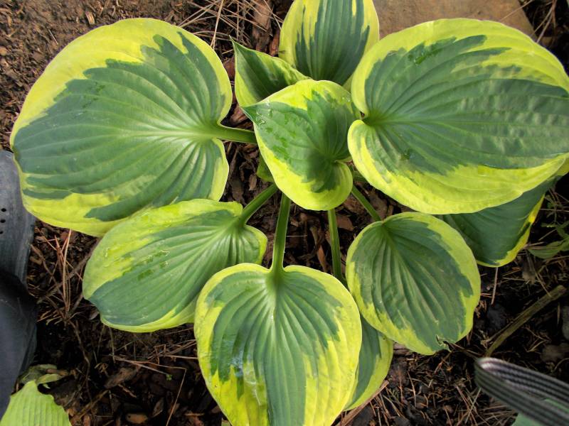 Moja Hosta ventricosa Aureomarginata wyrwana została z zabójczych szponów korzeni tuj, jako ogryzek, cień samej siebie. Teraz już osiągnęła jako takie rozmiary na naturalnie wilgotnym, cienistym stanowisku.