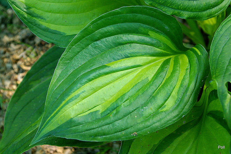 ventricosa Aureomaculata. Wiosną jest bardzo jaskrawa- mocno żółte centrum otoczone jest żywozielonym marginesem. Powierzchnia liścia lśni, odbijając promienie słoneczne, co jeszcze potęguje wrażenie jaskrawości. Wraz z upływem sezonu liście ciemnieją, stają się coraz bardziej zielone. Bardzo ciekawa hosta, ale chyba głownie dla ogrodów kolekcjonerskich