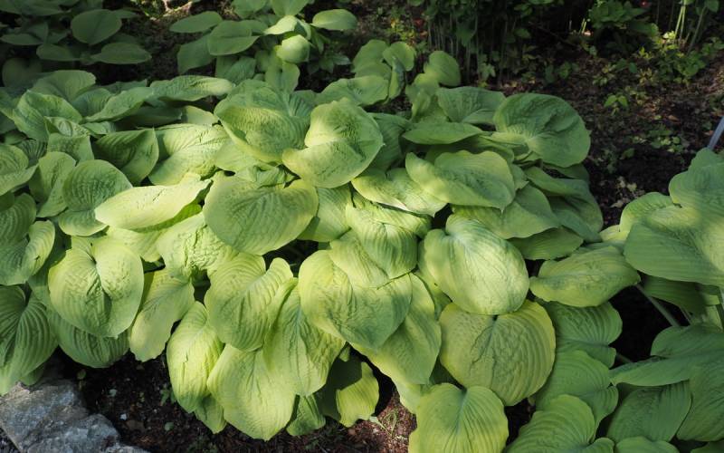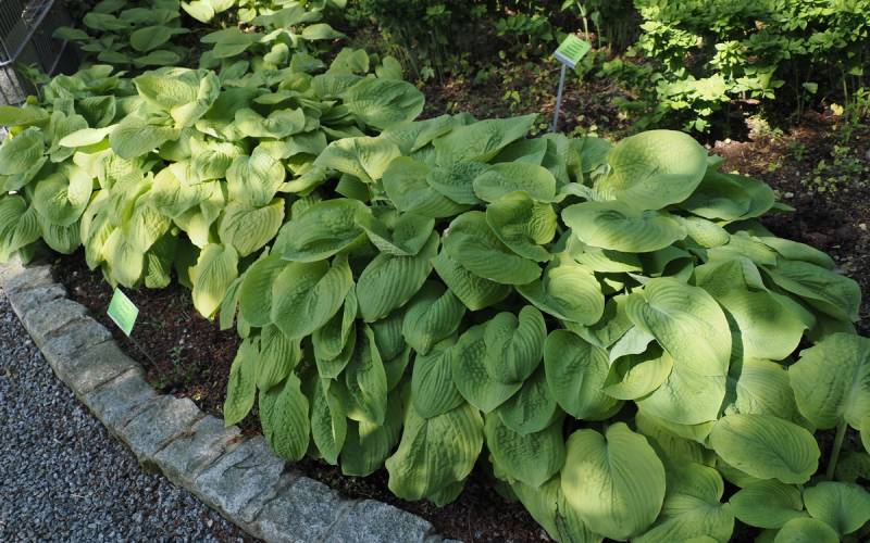 Rozmiar M wysokość 45-50cm Liście prawie okrągłe, wiosną jasno-żółte, zielenieją w ciągu sezonu. Kwiaty blado lawendowe /VI-VII/ i prawie okrągłych liściach. Zalecane stanowisko: półcieniste /toleruje większe nasłonecznienie/