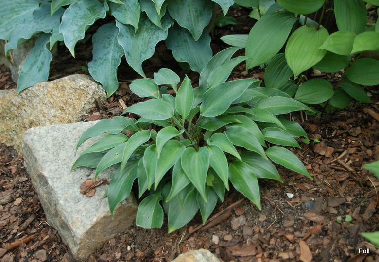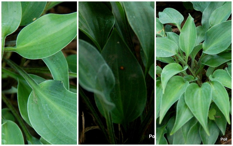 Liście: nieduże, o wymiarach 11x 6 cm, sercowato-podłużnego kształtu, nieco wzniesione sztywno ku górze i osadzone na nieco podczerwienionych ogonkach ; niebieskoszare, lekko falujące; wiosną pokryte puderem, sprawiającym wrażenie, że są matowe; spód liścia także przypudrowany