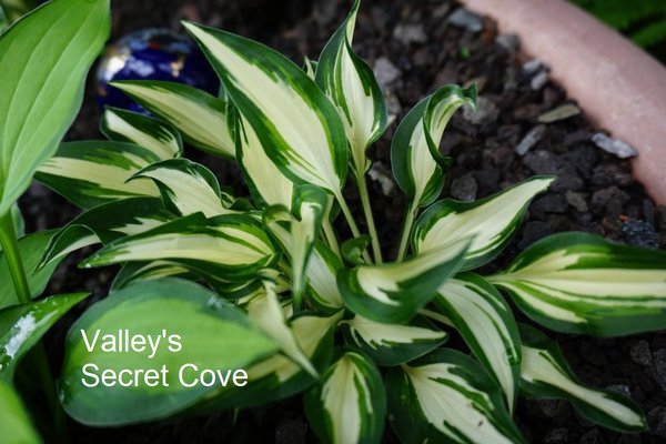 Rozmiar D wedle danych rejestracyjnych ma osiągać tylko około 10 cm wysokości przy 20 cm szerokości Liście: lancetowate, lekko skręcone, o wymiarach około 6 x 3 cm... kremowo białe, z czasem czysto białe centrum z nieregularnym, zielonym marginesem Kwiaty: jasnolawendowe (VI/VII) na 20 cm łodygach Zalecane stanowisko: pólcień/cień