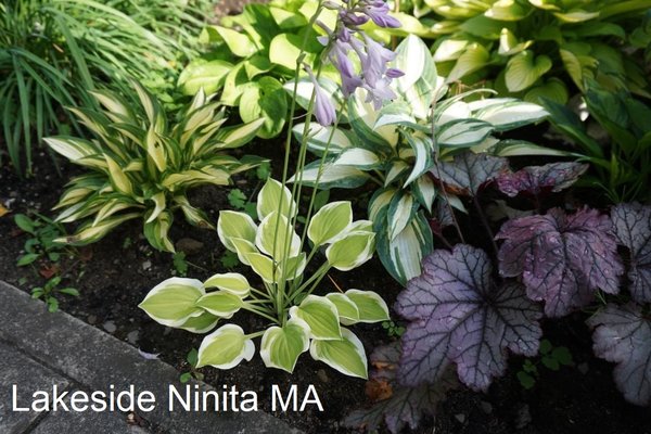 Rozmiar D/S wedle danych rejestracyjnych ma osiągać 10 cm wysokości przy 30 cm szerokości Liście: sercowate, o wymiarach blisko 8 x 6 cm... jasnozielone centrum z delikatnie pofalowanym, kremowobiałym marginesem... lekko błyszczące z wierzchu, od spodu matowe Kwiaty: lawendowe (VI/VII) na 40 cm łodygach Zalecane stanowisko: półcień/cień