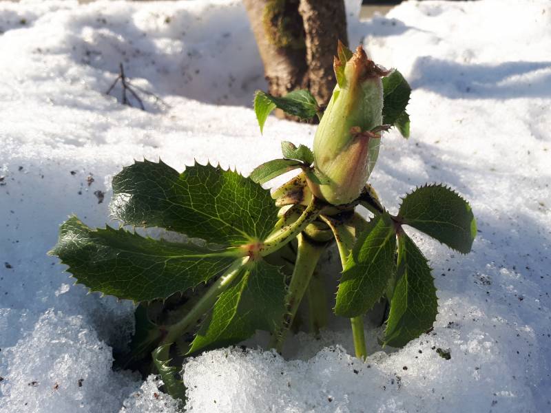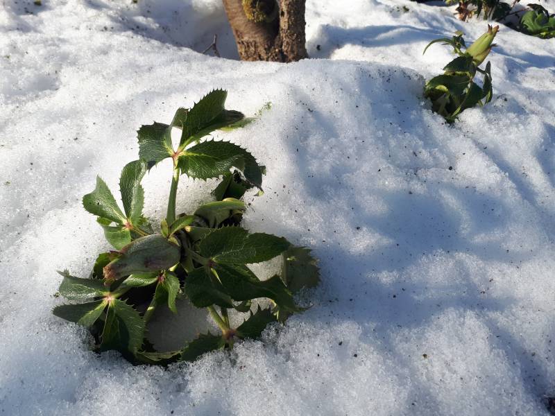 Mój egzemplarz 'Green Dwarf' trafił do donicy i mimo -4C w nocy, dzielnie rozwija kwiaty. Na fotce, z Helleborus argutifolius 'Silver Lace' (po prawej)