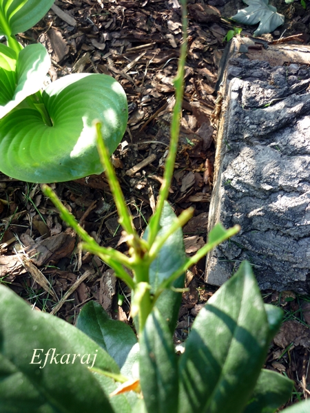Do tej pory nie dane mi było przyłapać opuchlaka na rodkowym liściu. Zdarzyło mi się to na tarasie, w domu oraz raz na liściu, ale hościanym. A tu proszę, tylko pomyślałam, by zacząć pisać niniejszy tekst a on objawił mi się znienacka podczas wieczorowego oglądu ogródka. Było tuż po godzinie 20. Co najmniej jakbym poprosiła go o zapozowanie, by ten wątek zilustrować.