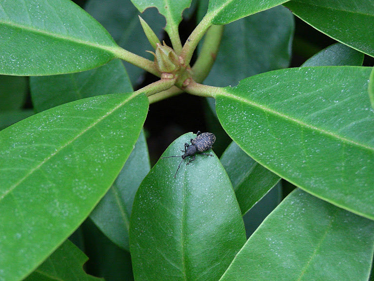 ---> Dorosłe osobniki żerują na liściach różaneczników, tudzież na liściach innych roślin. U mnie oprócz rodków podżerane są też winobluszcz, trzmielina, hortensja pnąca, bergenia, ale potencjalnych roślin, które robią za opuchlakową stołówkę jest dużo więcej. Zaliczają się do nich bluszcze, cisy, tuje, śliwy, czeremchy.