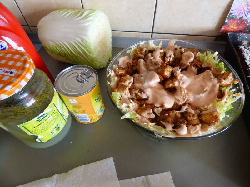 Na to mięso usmażone z kurczaka zimne,sos plus ogórki cebula,kukurydza na wierz trochę sosu i garść kapusty pekińskiej,przykrywamy folią i na 20 minut odstawiamy do lodówki,po tym czasie mieszamy wszystko dokładnie .