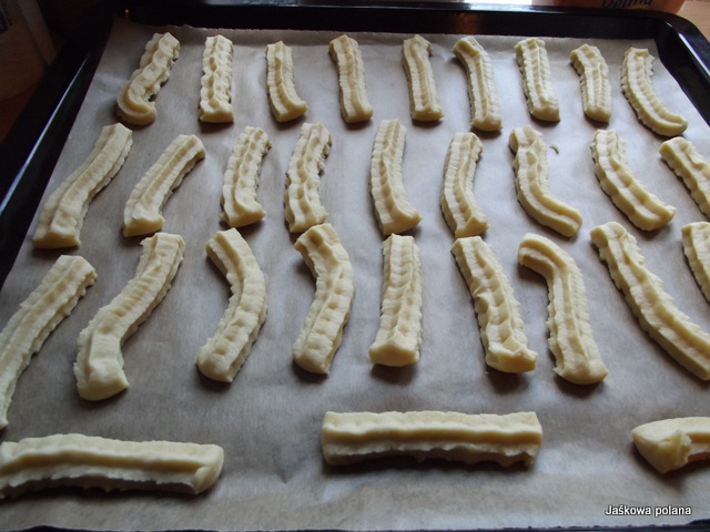 Ciasto rozwałkować na desce, wycinać foremką i piec w temp. 160