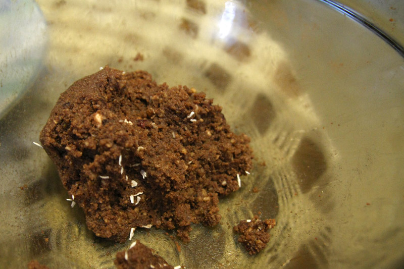 Trudno mówić o proporcjach, ale ja do moich okruchów wsypałam 2 łyżki kakao, wlałam 2,5 łyżki amaretto (może być rum, nalewka wiśniowa lub inny aromatyczny alkohol) oraz ćwierć kostki miękkiego masła. Wszystko ze sobą połączyć i ugnieść. Z tego "ciasta" uformować kuleczki i obtaczać w kakao lub wiórkach kokosowych, schłodzić i jeść!