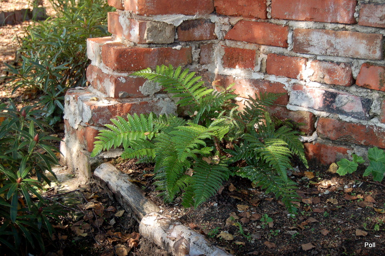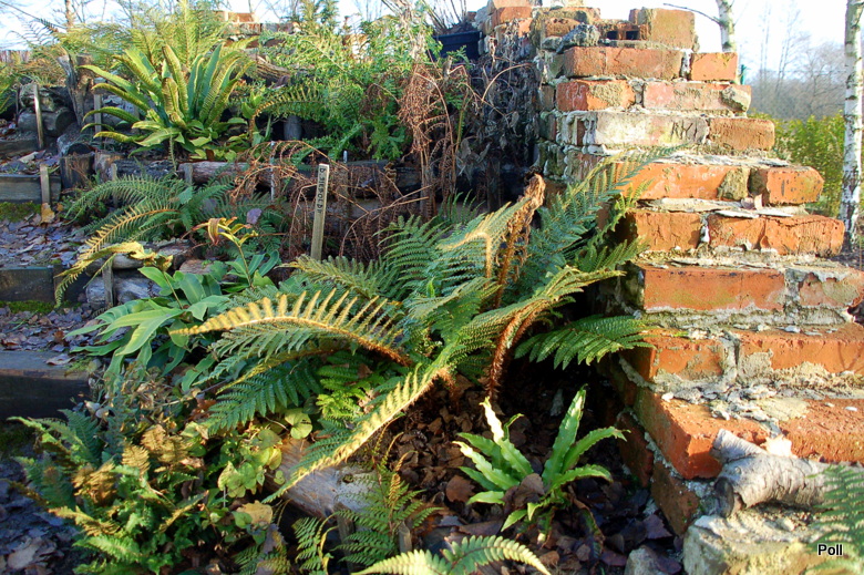 Inny, nieco młodszy egzemplarz Polystichum polyblepharum 'Jade' za murem oporowym stoku paprociowego