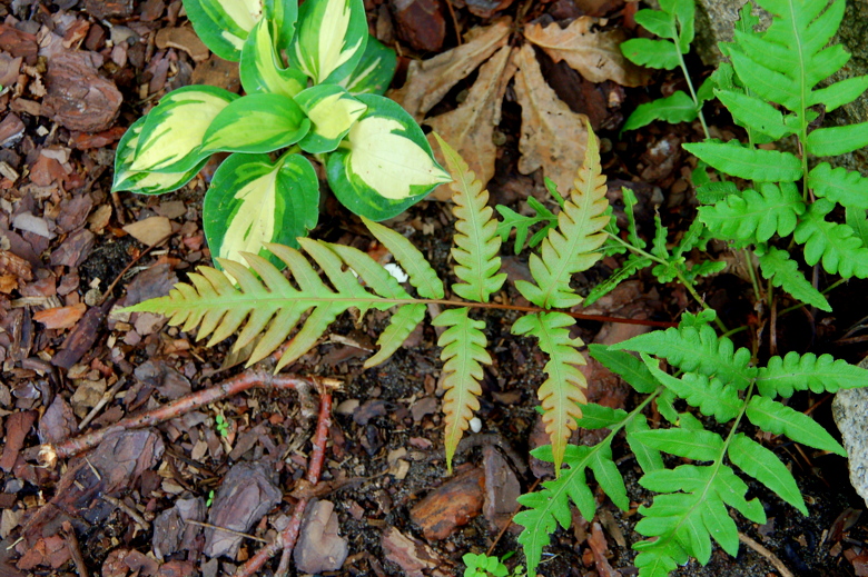 Polypodium vulgare. Rozwijajace się pastorały i młode liście mają niesamowity kolor, może on być miedziany, jasnoczerwony, pomarańczowy, czy nawet burgundowy - w zależności od wieku liścia. Tim Pynter jednak jeszcze bardziej wikła sprawę pisząc, iż tak naprawdę, w uprawie może znajdować się sporo różniących się od siebie paproci tego gatunku, gdyż różne miejsca i warunki uprawy spowodowały jego zmienność zarówno w kolorze, jak i innych cechach. Kolor młodych frondów utrzymuje się dość długo, ale z biegiem dojrzewania liści zanika, zmieniając się w soczystą zieleń.