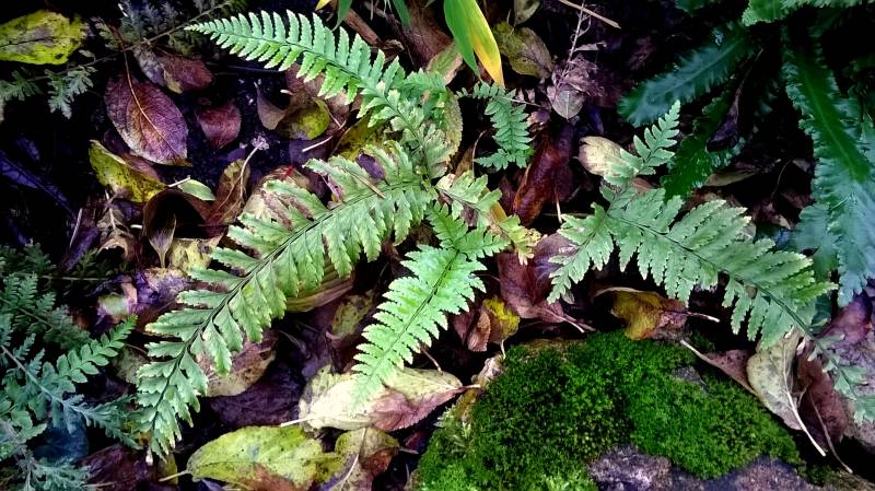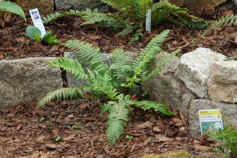 Polystichum tripteron, od ubiegłego sezonu sporo podrósł. To ciekawy paprotnik tworzący regularne rozety. Łatwy do rozpoznania dzięki rozgałęzieniom u nasady liści.