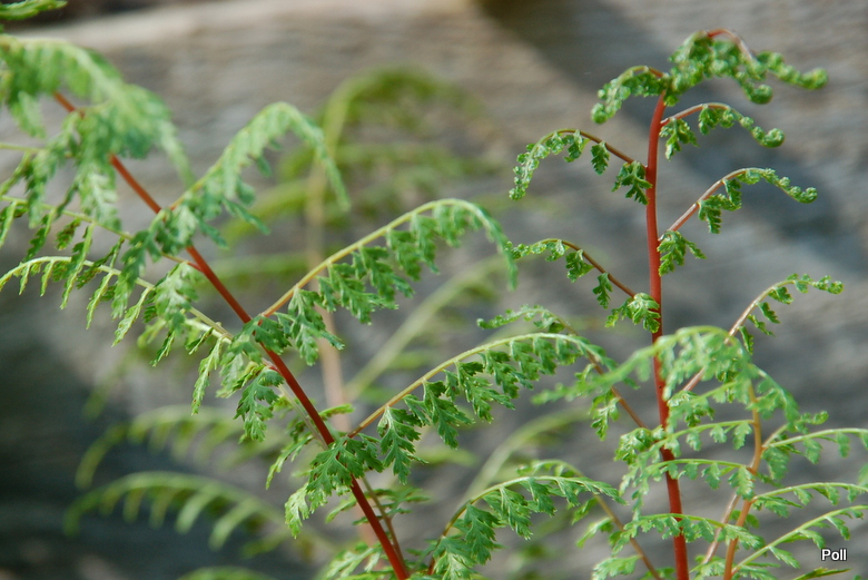 wietlica samicza. Jasnozielone, lekko pierzaste listki położone są mijankowo, parami, na wyraźnie czerwonych osadkach a ich wierzchołki mogą być czasem rozszczepione, tworząc 2, lub 3 ząbki. Zarodniki są ukryte pod spodem liści i osłonięte brązowymi zawijkami o kształcie litery J, lub U.