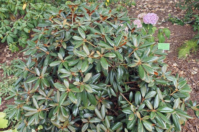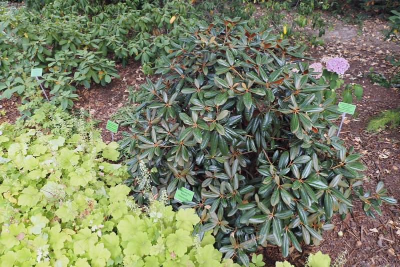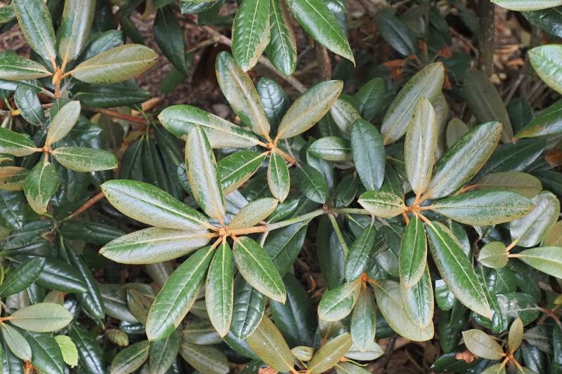 Liście: oliwkowozielone i błyszczące z wierzchu, od spodu z czerwonawo pomarańczowym, mocno filcowanym indumentum... eliptyczne do wąsko eliptycznych... o długości do 12,5 cm przy szerokości do 5 cm... młode pokryte kutnerem, początkowo szaro białym, z czasem zyskującym bardziej wyraziste, cynamonowe wybarwienie... utrzymują się na krzewie przez 3-4 lata