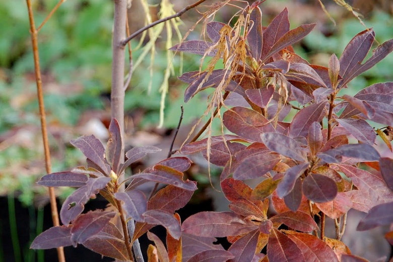 Liście: sezonowe, ciemnozielone, błyszczące... młode ciemnobrązowo czerwone... jesienią przebarwiające się ponownie na brązowo