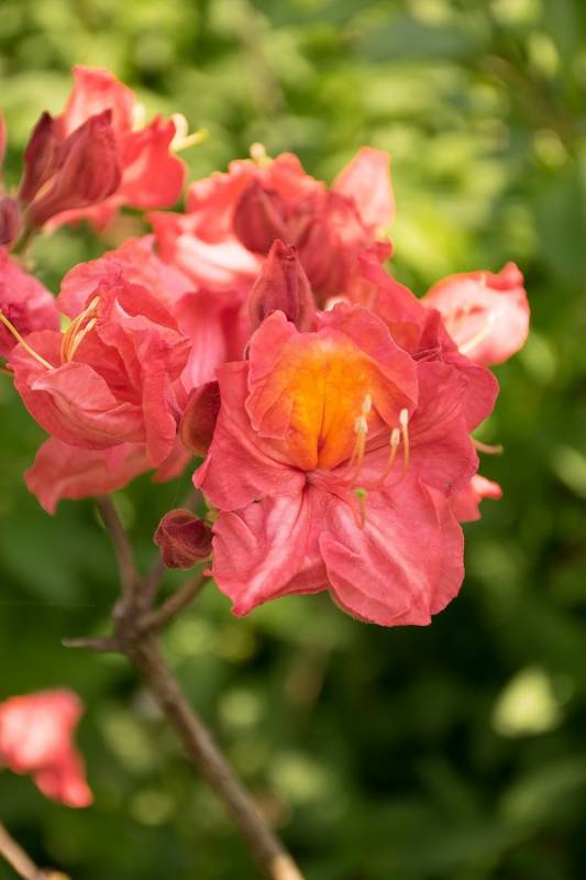 Kwiaty: w pąku prawie czerwone, po otwarciu ciemnoróżowe z dużą, złocistą do intensywnie pomarańczowej plamką rozlaną na górnym płatku... brzegi płatków pofalowane... średnica pojedynczego kwiatu od 6,5 do 7,5 cm... zebrane po 9-12 sztuk w kuliste, wierzchołkowe kwiatostany