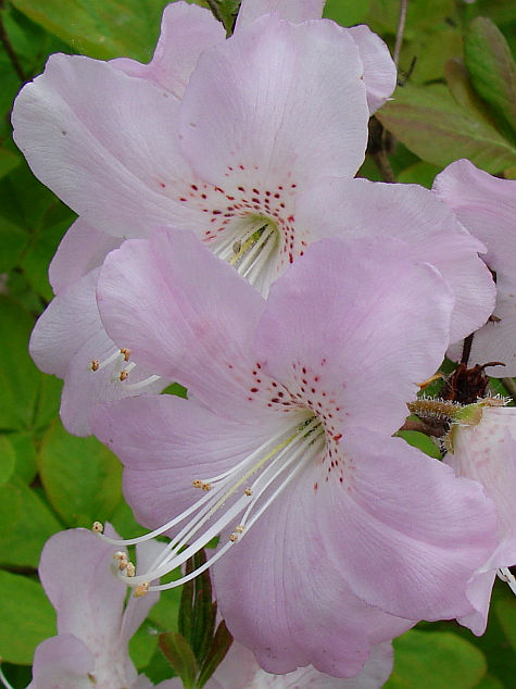 Kwiaty: zwykle jasno- lub ciemnoróżowe z nielicznymi purpurowymi cętkami... czasem białe z zielonymi cętkami... szeroko dzwonkowate... największe wśród gatunków azalii, średnica pojedynczego kwiatu od 5,50 do 8 a nawet i 15 cm... 10 pręcików... zebrane po 3-10 sztuk w wierzchołkowe kwiatostany