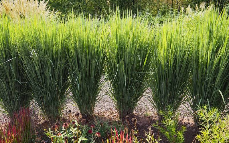Proso 'Straight Cloud' na całkowicie słonecznym stanowisku o słabej, piaszczystej glebie (po prawej widać działający tryskacz, który leje wodę bezpośrednio na jedną z kęp)