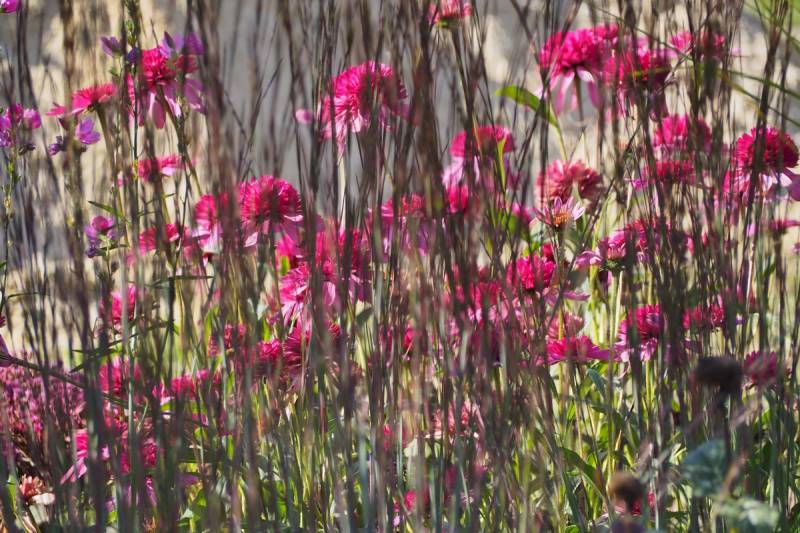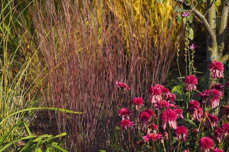 pozostaje w pozycji pionowej cały sezon, nie pokłada się; kwitnie lipiec-październik