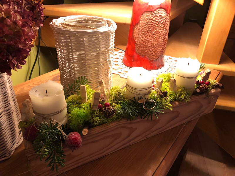 Moja dekoracja jest trochę odbiegająca od tradycji ,bo nie ma w niej choinki ale w późniejszym czasie z gałązkami choinek będzie stała na szafce.