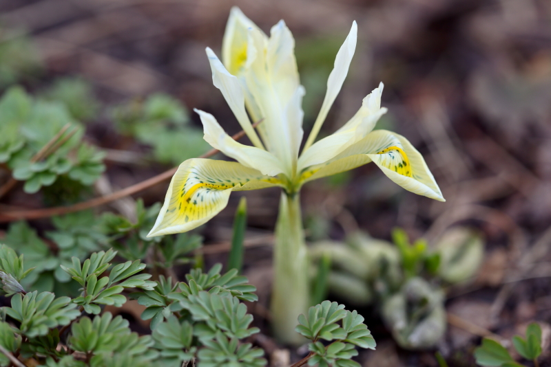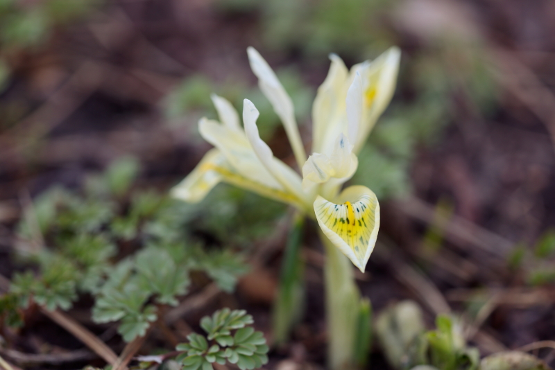 Zaczyna kwitnąć niewielka kępka irysów żyłkowanych ‚Katherine’s Gold” .