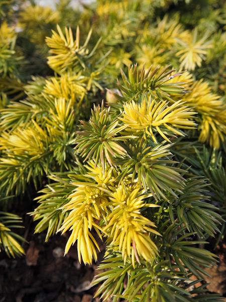 Wolno rosnący, iglasty krzew okrywowy o dwubarwnych, złocisto-zielonych gałązkach. Po 10 latach uprawy dorasta do 0,2 m wysokości i około 0,5 m szerokości. Pędy są krótkie, rozpostarte na wszystkie strony, ścielące się po ziemi. Gałązki obficie i gęsto ulistnione, zielone z licznymi zabarwionymi na żółto fragmentami rozproszonymi przypadkowo w obrębie rośliny. Mrozoodporny