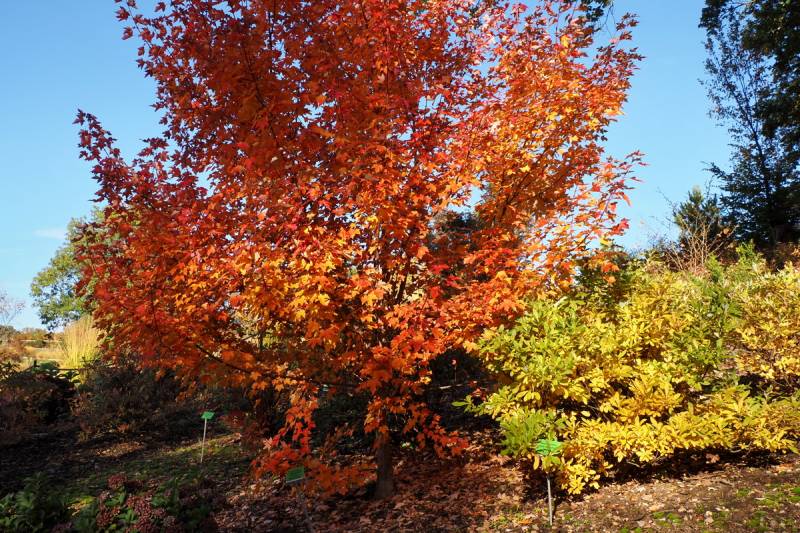 w przeciwieństwie do gatunku jego liście nie ulegają chlorozom i żółknięciu w przypadku uprawy na glebach o nieodpowiednim, zbyt wysokim pH Wielkość: dorasta do 15 m wysokości, ma silny przewodnik i regularnie ułożone gałęzie, tworzy szeroko-stożkowatą koronę Liście: trójklapowe, na brzegach nieregularnie ząbkowane, u nasady sercowate, z wierzchu ciemnozielone i błyszczące, od spodu jaśniejsze, matowe, jesienią przebarwiają się na intensywnie czerwony kolor. Mrozoodporność: dobra.
