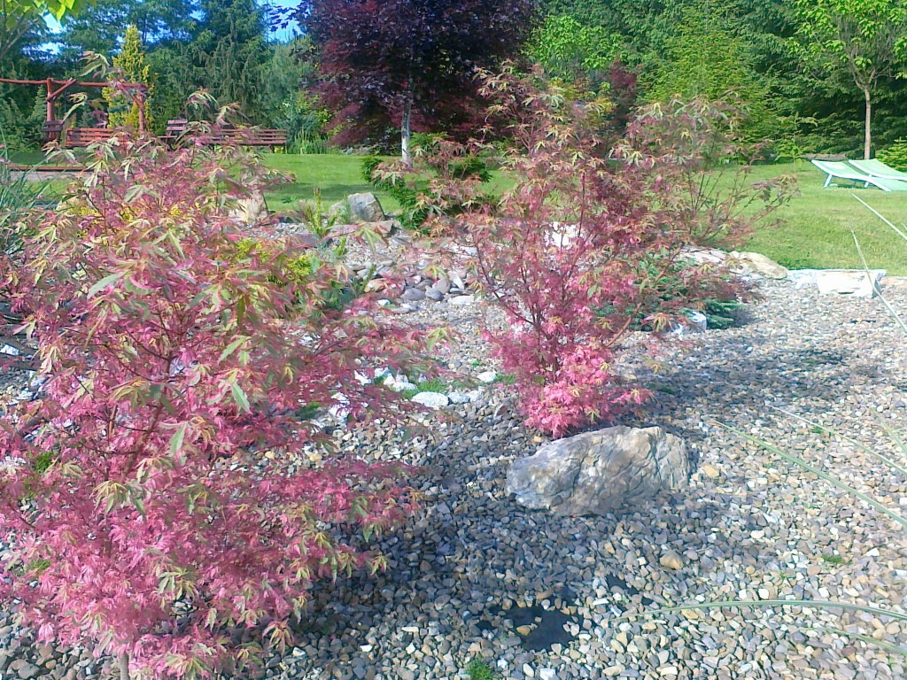 Sango Kaku cudnie się przebarwia na przestrzeni sezonu (ma w dodatku fantastyczne czerwono-różowe zabarwienie pnia i gałązek), a Inaba Shidare tworzy niezwykłą parasolkę pokrojem swojej korony...