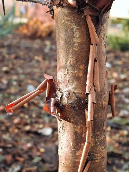 W moim ogrodzie rośnie trzeci sezon. Kora na ten moment łuszczy się, ale tylko na grubszych gałęziach, w koronie.