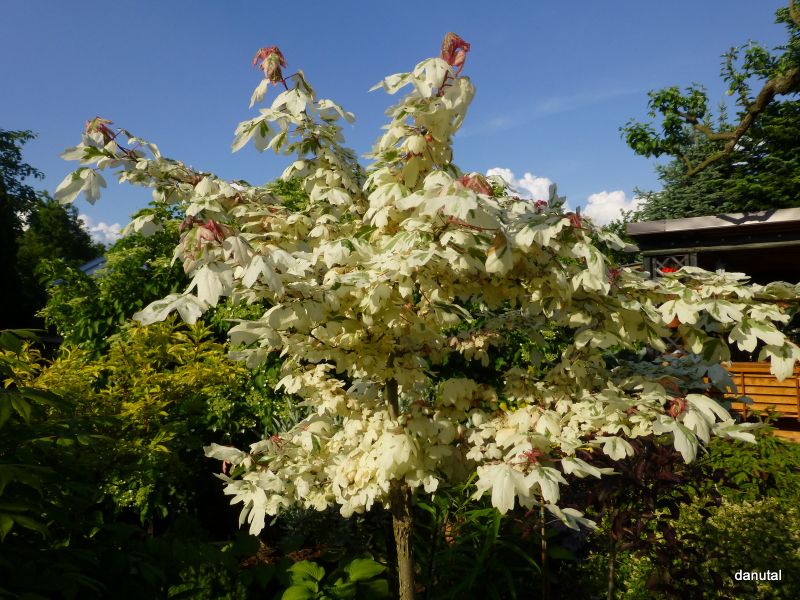 Liście: 3- do 5-cioklapowe, do 10 cm szerokości, zaokrąglone, dwukolorowe: ciemnozielone centrum z szerokim, kremowobiałym obrzeżem, młode liście i pędy różowawe