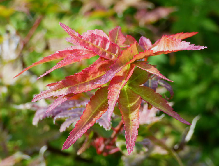 Pochodzenie: odmiana znana w Japonii przed rokiem 1900 Wymagania: stanowisko słoneczne lub półcieniste, osłonięte od wiatru, gleba równomiernie wilgotna, próchniczna, o odczynie lekko kwaśnym Wielkość: dorasta do 3-4 m Pokrój: rozłożysty Liście: 5-klapowe, głęboko wcięte aż do nasady, dość małe 5-6 cm, różowo szkarłatne wiosną, jasnozielone latem, jesienią wybarwiają się na czerwono Mrozoodporność: młode egzemplarze zaleca się okrywać na zimę