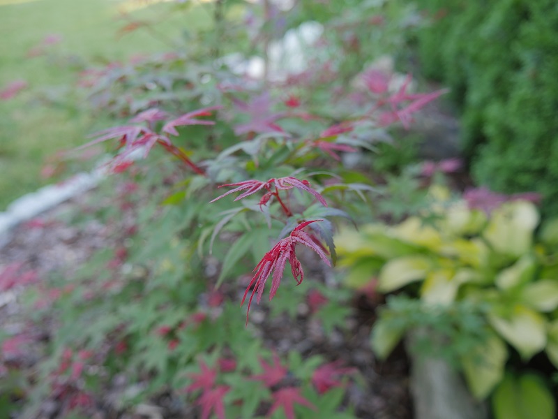 Liście: nieduże o średnicy około 5 cm. Wczesną wiosną ogniście czerwone żeby przebarwić się na różowo-czerwone, latem zielone, a jesienią pomarańczowe i czerwone. Do jesieni klon wypuszcza nowe, czerwone przyrosty więc jest kolorowy przez cały sezon