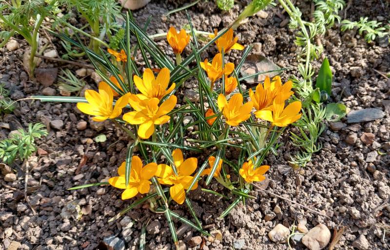 Crocus chrysanthusApril Night ma kwiaty średniej wielkości, ciemnoniebieskie z ciemnobrązową podstawą.
