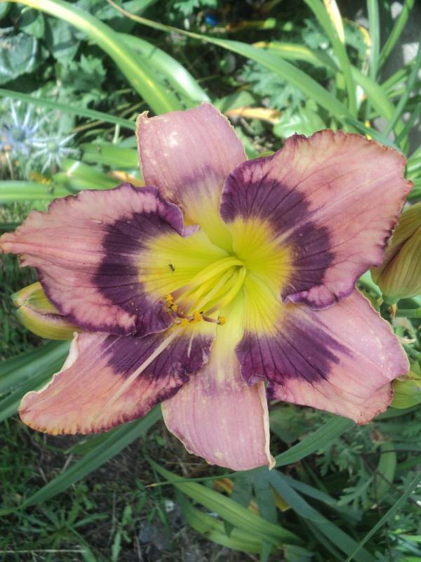 Kwiaty:duże ,płasko otwarte,lawendowo-fioletowe , z ciemniejszym fioletowo -niebieskim okiem i taką samą krawędzią płatków , gardło żółte, śr ok 16-17 cm