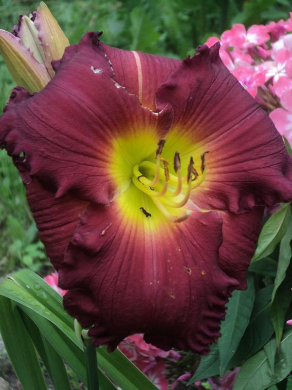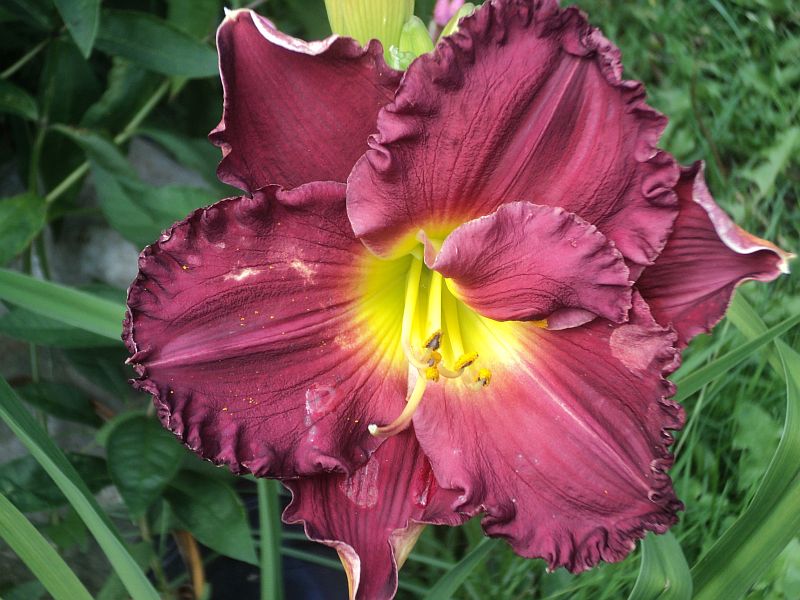 Hodowca: Shooter , rok rejestracji 2000 Wysokość: ok 60 cm Kwiaty: w kolorze burgunda z żółto- zielonym gardłem , falbanka na brzegach płatków , średnica ok 15-16 cm.