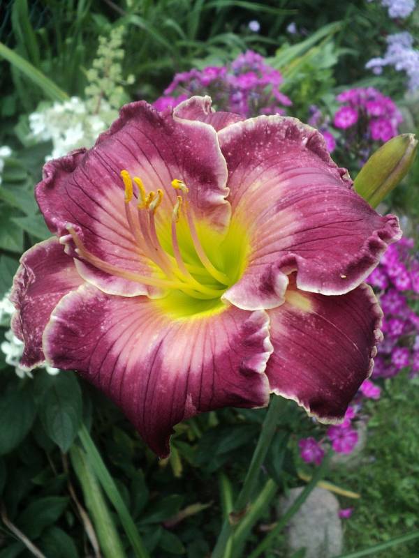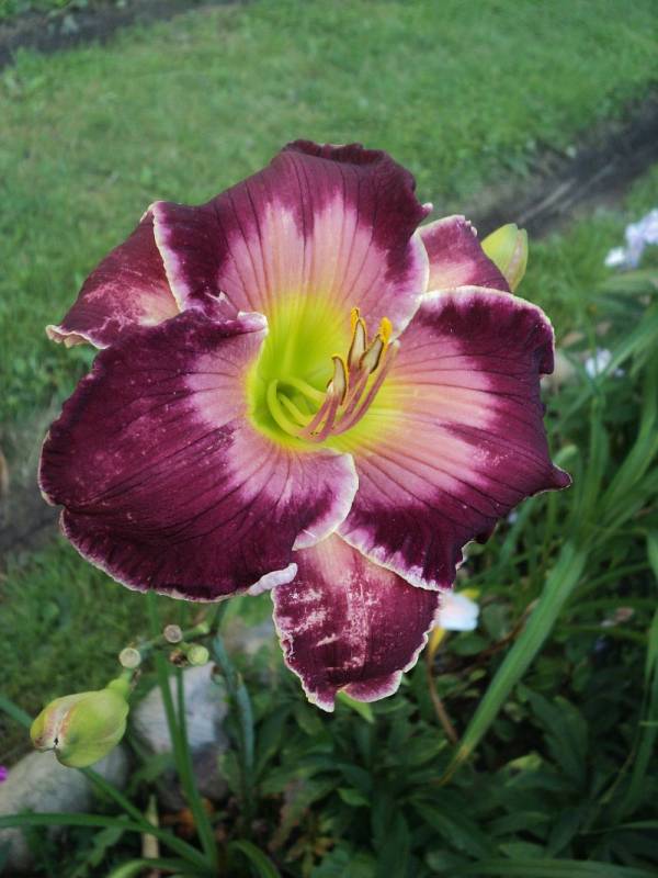 Hodowca: Rogers-C,2007 Wysokość: pęd kwiatowy na wysokości 80 -90 cm. Kwiaty:czerwono -fioletowe , z różowym znakiem wodnym nad masłowo- zielonym gardłem, brzegi płatków zaznaczone na biało leciutko sfalowane , średnica ok 15 cm , kwiat otwiera się szeroko. Zakwita w lipcu. Stanowisko: słoneczne do półcienistego. Mrozoodporność: zimuje bez okrycia.