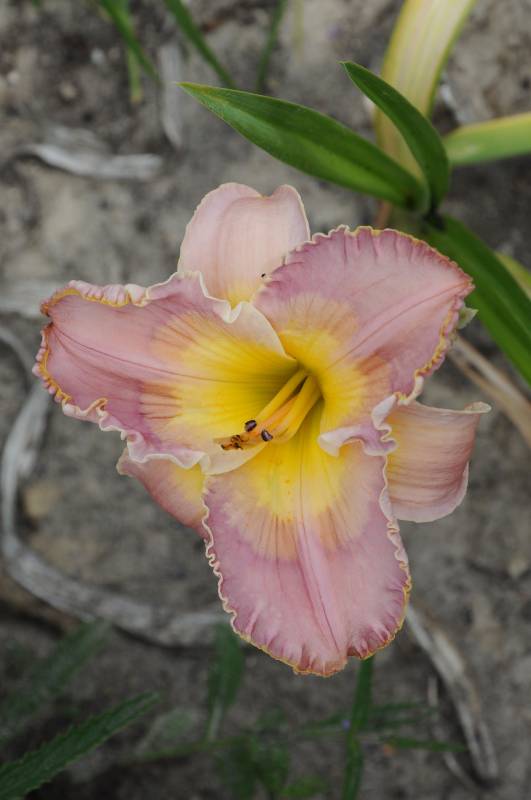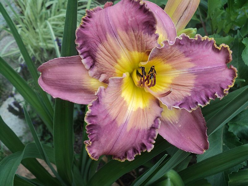 Kwiaty: lawendowo- różowe ze znakiem wodnym i zielono -złotym gardłem o średnicy ok 15 cm. Kwiaty otwarte szeroko Zakwita w lipcu .