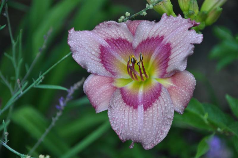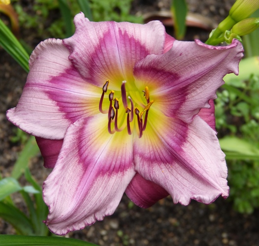 hodowca: Shooter, 1993 wysokość: 60-70 cm kwiat: 14cm w kolorze foletowo-różowym, z wyraźnym mocno różowym okiem i zielonym gardłem. Wykazują sporą zmienność w zależności od pogody. termin kwitnienia: lipiec-sierpień