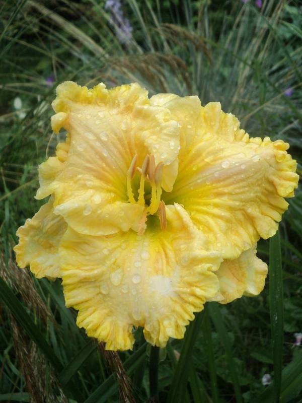 Kwiaty: koloru żółtego melona, gardło zielone , mocno falowany brzeg ,rzeźbione wnętrze płatków, średnica 15 cm. Zakwita w lipcu .
