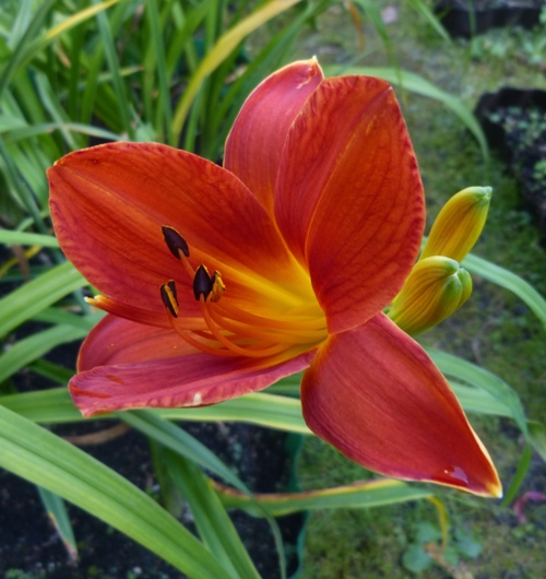 kwiat 18 cm, czysto czerwony z lekko zielonkawą gardzielą, może powtórzyć kwitnienie. Zakończenia sepali sprawiają wrażenie jakby się zawijały do góry
