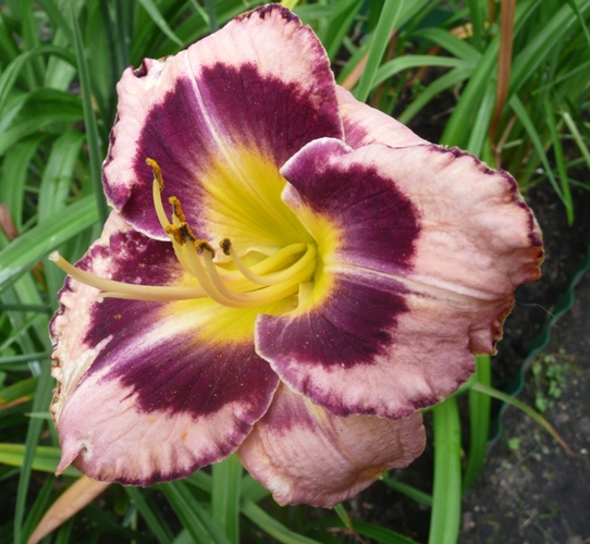kwiat 13 cm, antyczny róż z rodzynkowo śliwkowym okiem i żółtą przechodzącą w zieleń gardzielą (dokładne tłumaczenie z AHS - Antique rose with raisin plum eyezone and yellow to green throat) a po mojemu to "brudny" róż z przydymionym śliwkowym okiem. Może powtarzać kwitnienie.