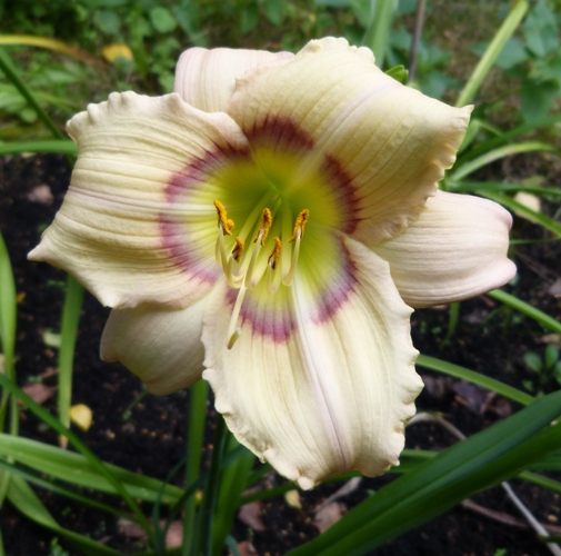 kwiat 11 cm, może powtarzać kwitnienie, jasno różowy z odcieniem kremu z "wielopasmową" strefą oka i zółtozieloną przechodzącą w zieleń gardzielą.