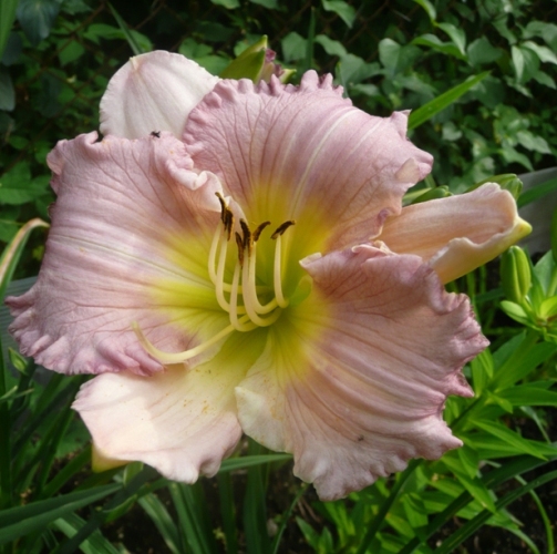 kwiat 15 cm, lawendowo różowe petale, jaśniejsze sepale, falbanka, oko prawie niewidoczne, zielono-żółta gardziel. Wybarwienie kwiatów bardzo zależne od pory dnia, nasłonecznienia. Słabo przyrasta ale pięknie kwitnie