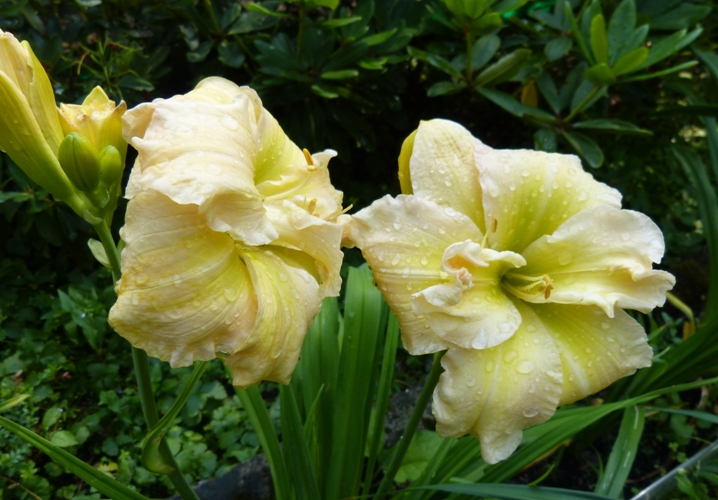 kwiat 12 cm, pełny w 80%, kremowo biały z zielonkawą gardzielą, może powtarzać kwitnienie