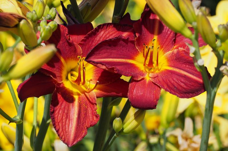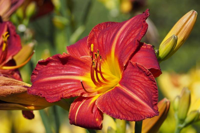 kwiat 15 cm, ciemnoczerwony (albo wg innego tłumaczenia głęboka czerwień) z żółto-zieloną gardzielą