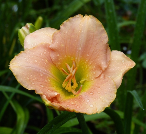 kwiat 13 cm, kości słoniowej z odcieniem pastelowego różu, dotknięta brzoskwinią złota krawędź (płatków) z szeroką żółtą aureolą (okiem) i limonkowo zieloną gardzielą (w oryginale wg AHS: Pastel ivory pink touched peach edged gold and wide yellow halo with lime green throat) Kolor określał jakiś poeta..... Ponoć powtarza kwitnienie i pachnie