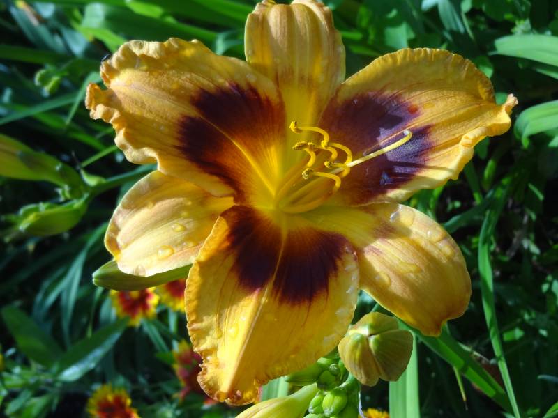 kwiat 14 cm, pomarańczowo żółty z szerokim czerwonym okiem i zielonkawo żółtą gardzielą, może powtarzać kwitnienie